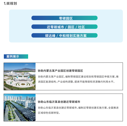 | 包含碳规划、碳咨询、碳资产管理、碳汇开发与碳交易、碳捕集、智碳平台运维。 |